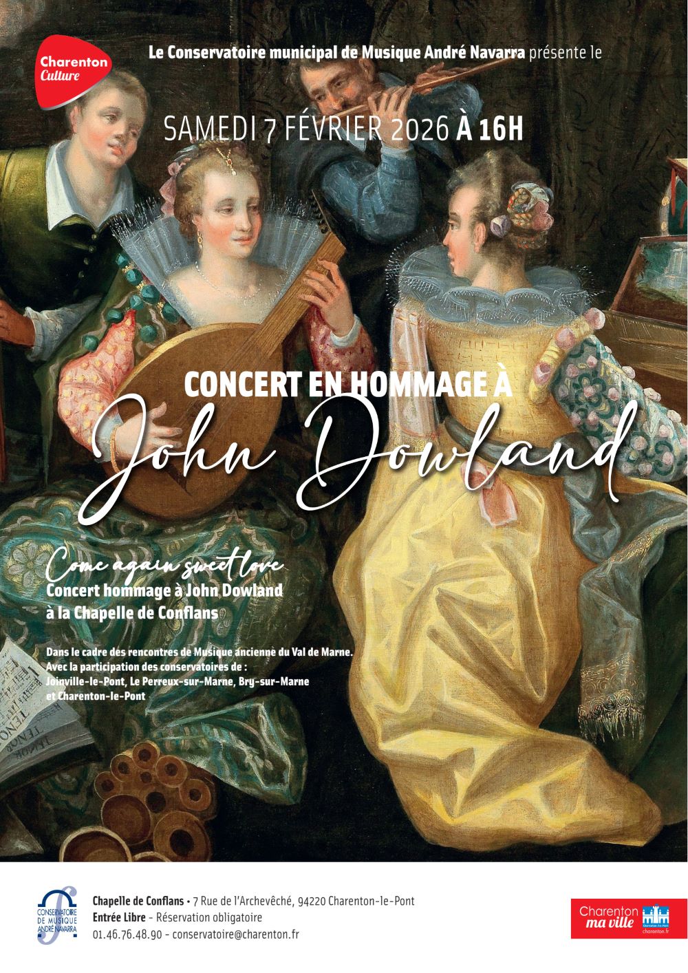 - Samedi 7 février à 16h : Concert John Dowland et la musique anglaise du début du XVIIème s. – à la Chapelle de Conflans – avec la participation des classes de musique ancienne de Bry Sur Marne, Le Perreux- Sur Marne et Joinville-Le-Pont