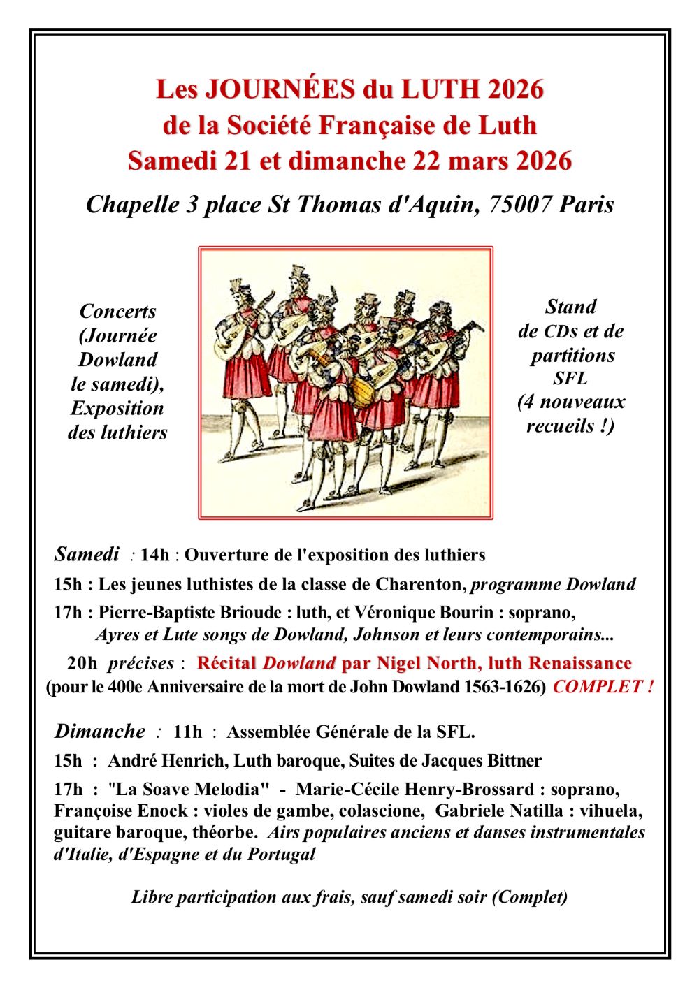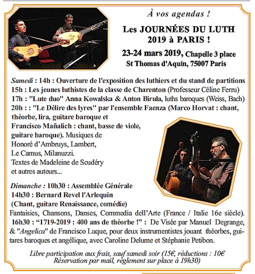 - Samedi 21 mars : 15h à la Chapelle Saint-Thomas d’Aquin – Paris : Concert de la classe de luth